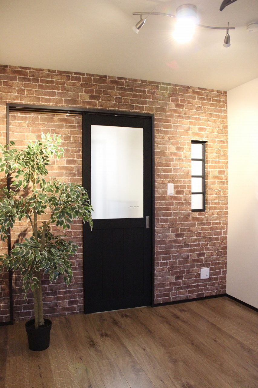 リビングから階段を上がるとレンガ調でシックな private room があり、ベランダと別に部屋干しのハンガーパイプも設置してます。