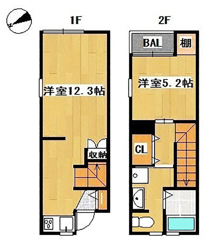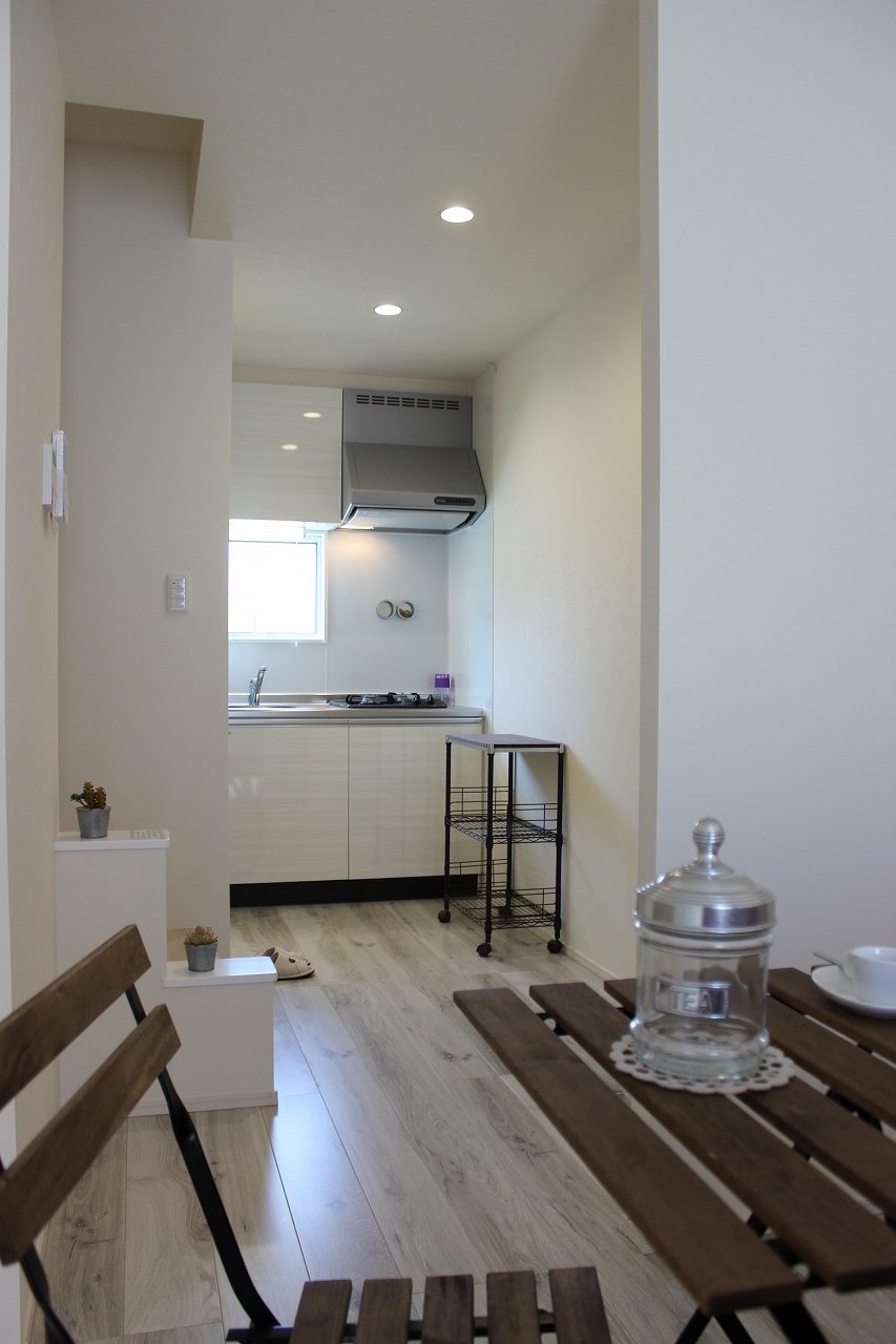 1Fにキッチン・リビング、2Fに寝室・トイレ・脱衣所。