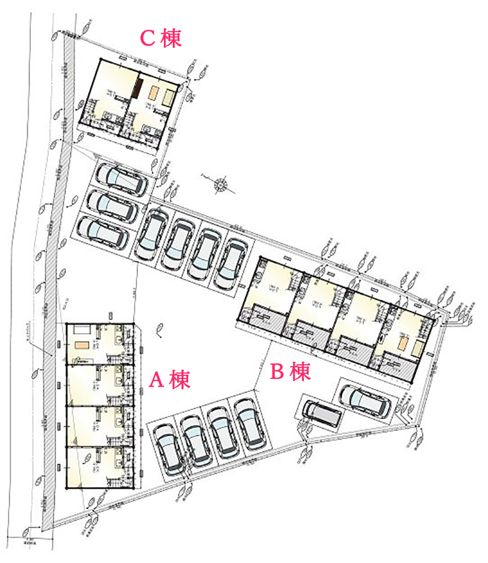 敷地内にはA棟 B棟 C棟の3棟があり どれも単身向けのアパートになりますが二人暮らしも可能な広さになっています。