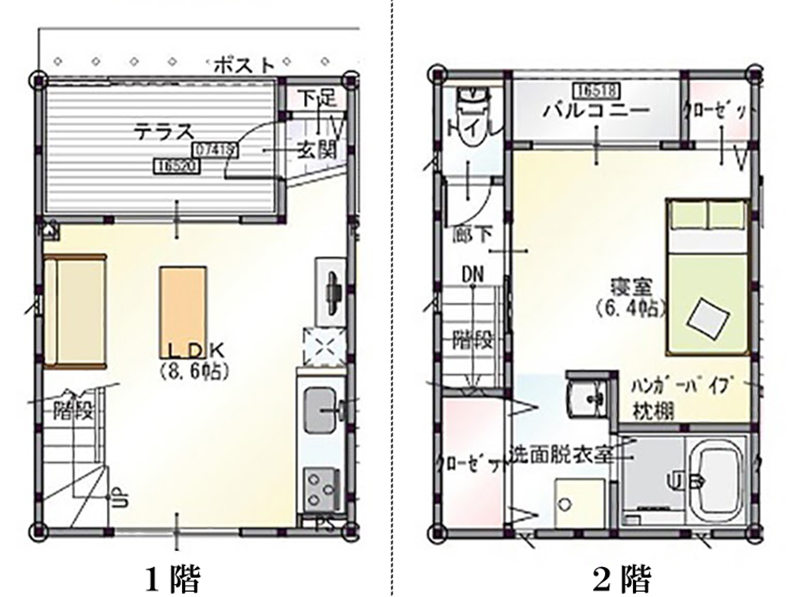 1階にキッチン・リビング・ダイニング2階に寝室とバス・トイレ。